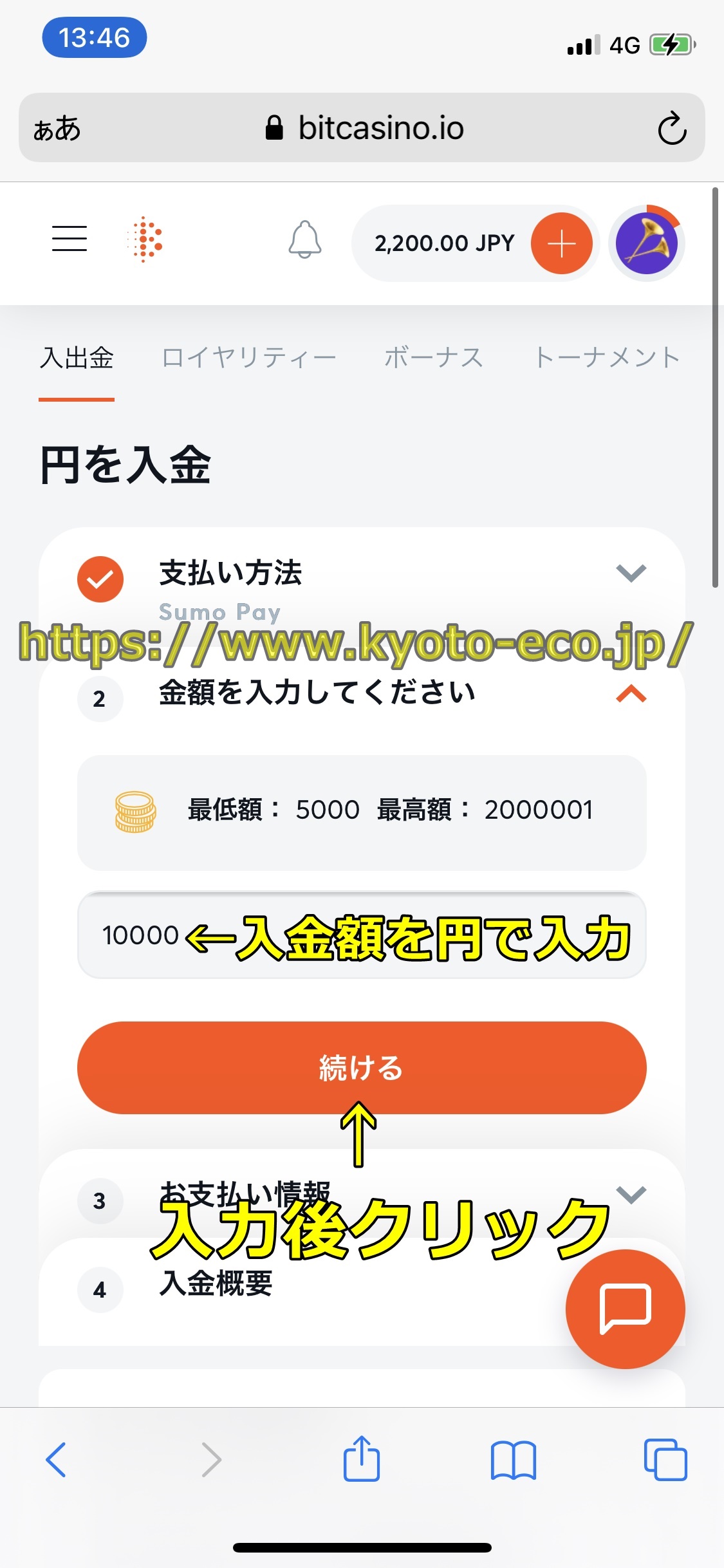 - 入金方法で「SUMO PAY」を選択