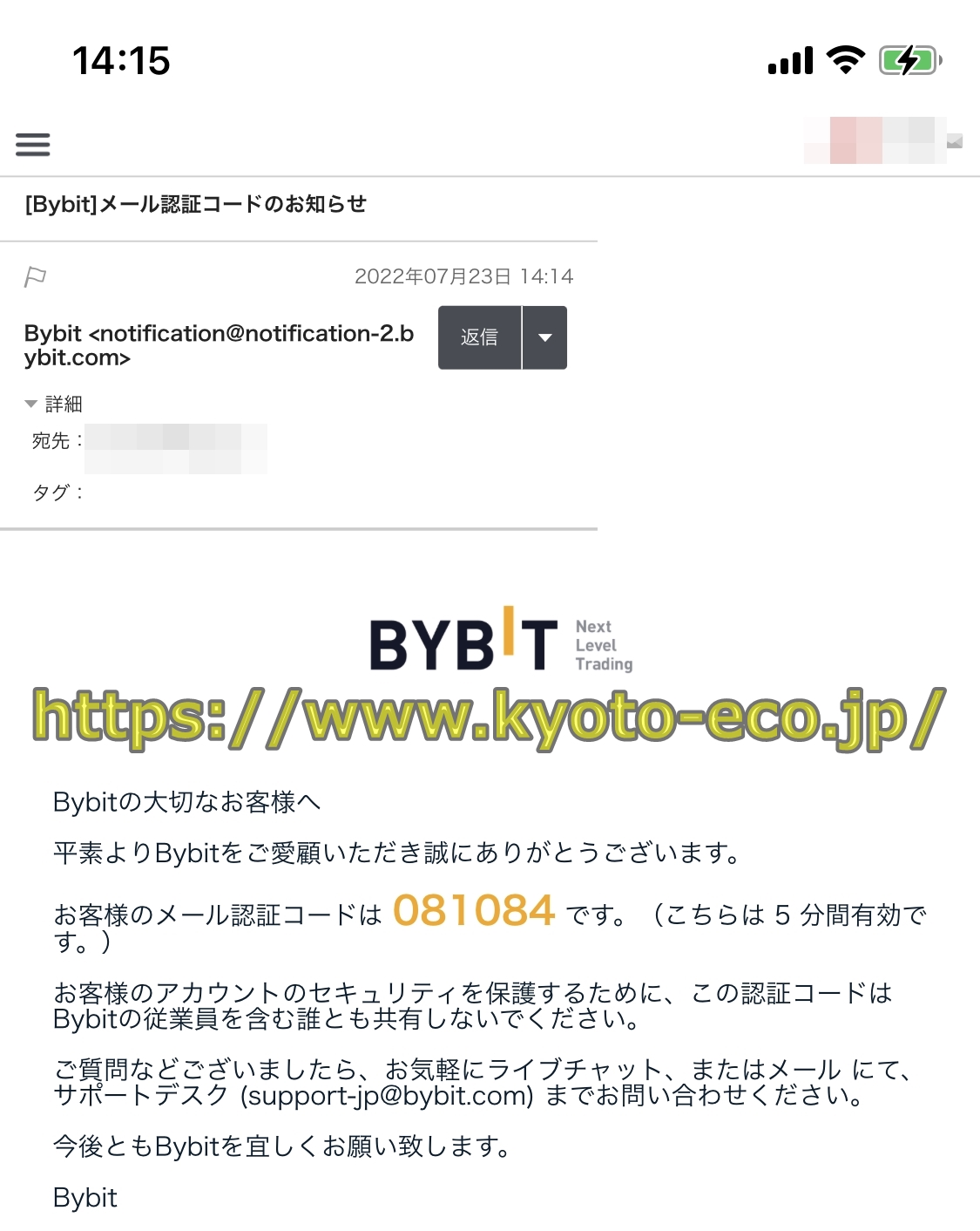 「コードを取得」をクリックするとバイビットの登録メールアドレス宛に認証コードが書かれたメールが届きますので、【認証コード送信先】の欄に認証コード(6桁の数字)を入力してください。