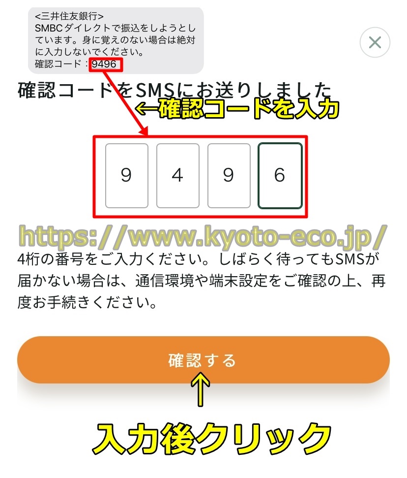 「SMSを受け取る」をクリックするとSMBCダイレクトの登録メールアドレス宛に下の図のように確認コード(4桁の数字)が送られてくるので、確認コードを入力して「確認する」をクリックしましょう。