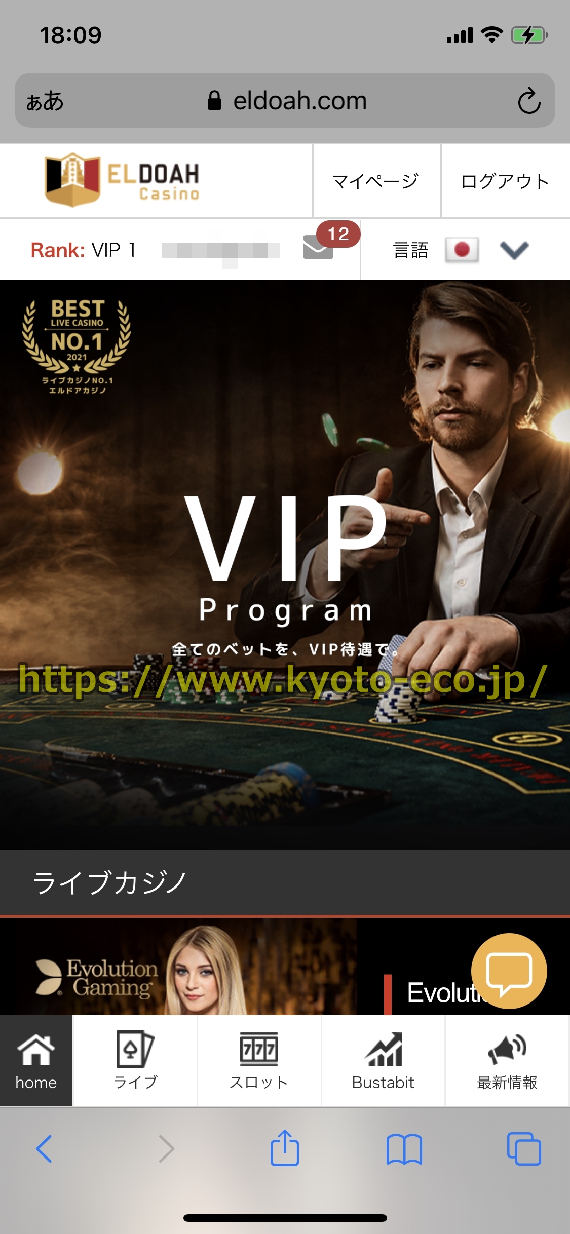 必要事項を入力して「サインアップ」をクリックすると下の図に示すようなエルドアカジノのトップページの画面が出て、画面右上に「マイページ」と表示されればエルドアライトの登録手続きは終わりです。