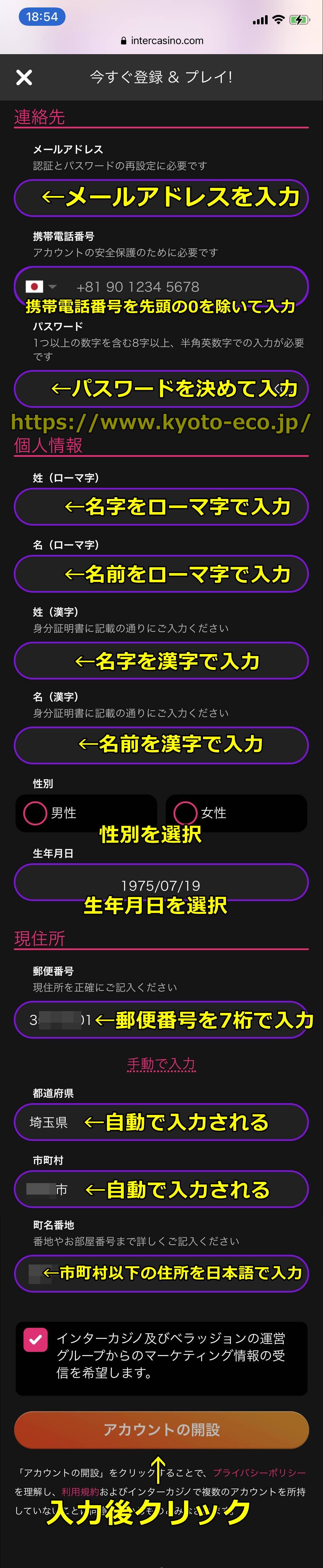 メールアドレスはヤフーメールなどのフリーメールもOKですが、インターカジノ(intercasino)からお得なボーナスキャンペーンなどのお知らせが届きますので、確実に受信できるメールアドレスを入力してください。