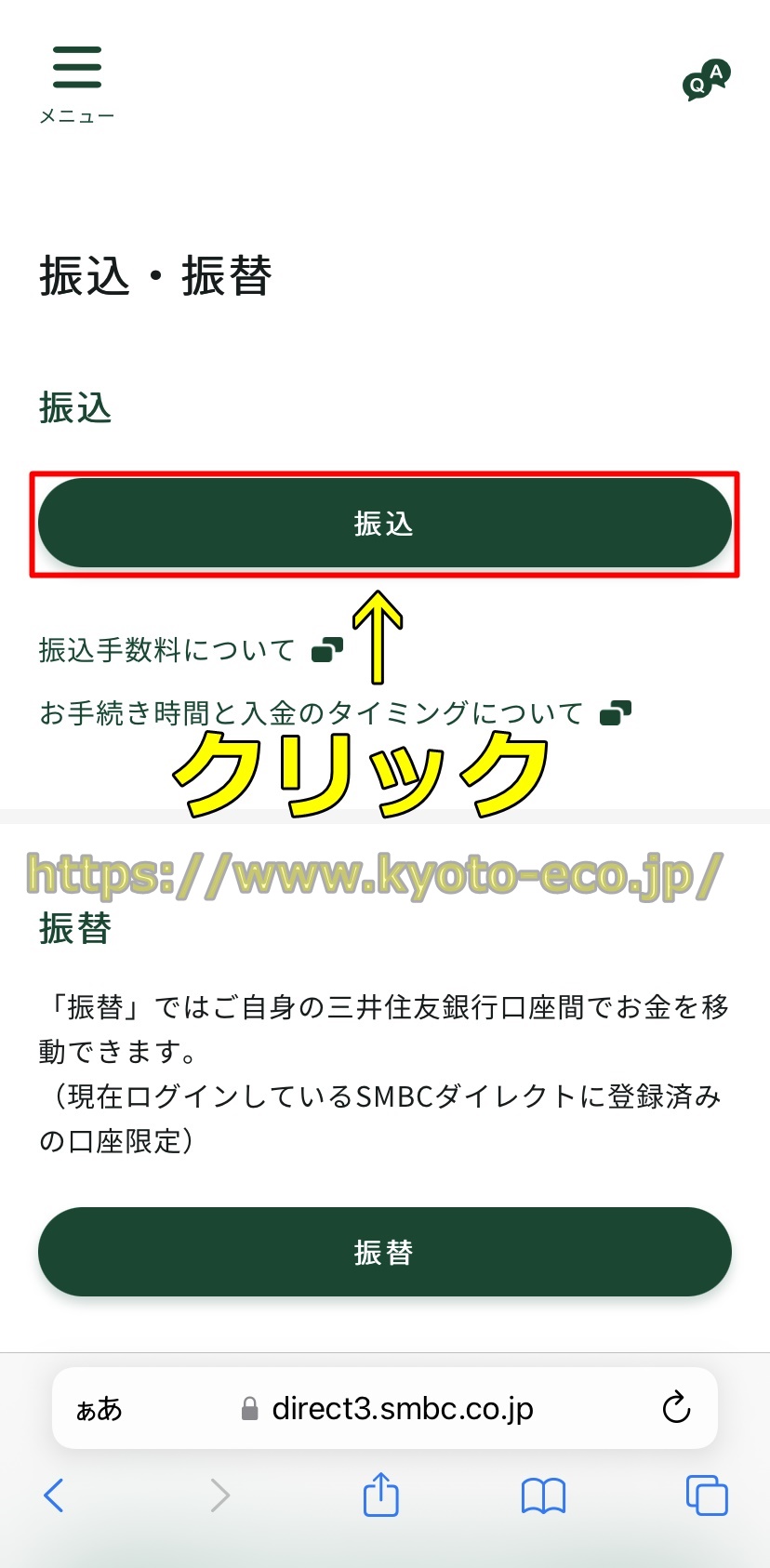 SMBCダイレクトにログインすると下の図のように画面が表示されるので、「振込・振替」をクリックしてください。