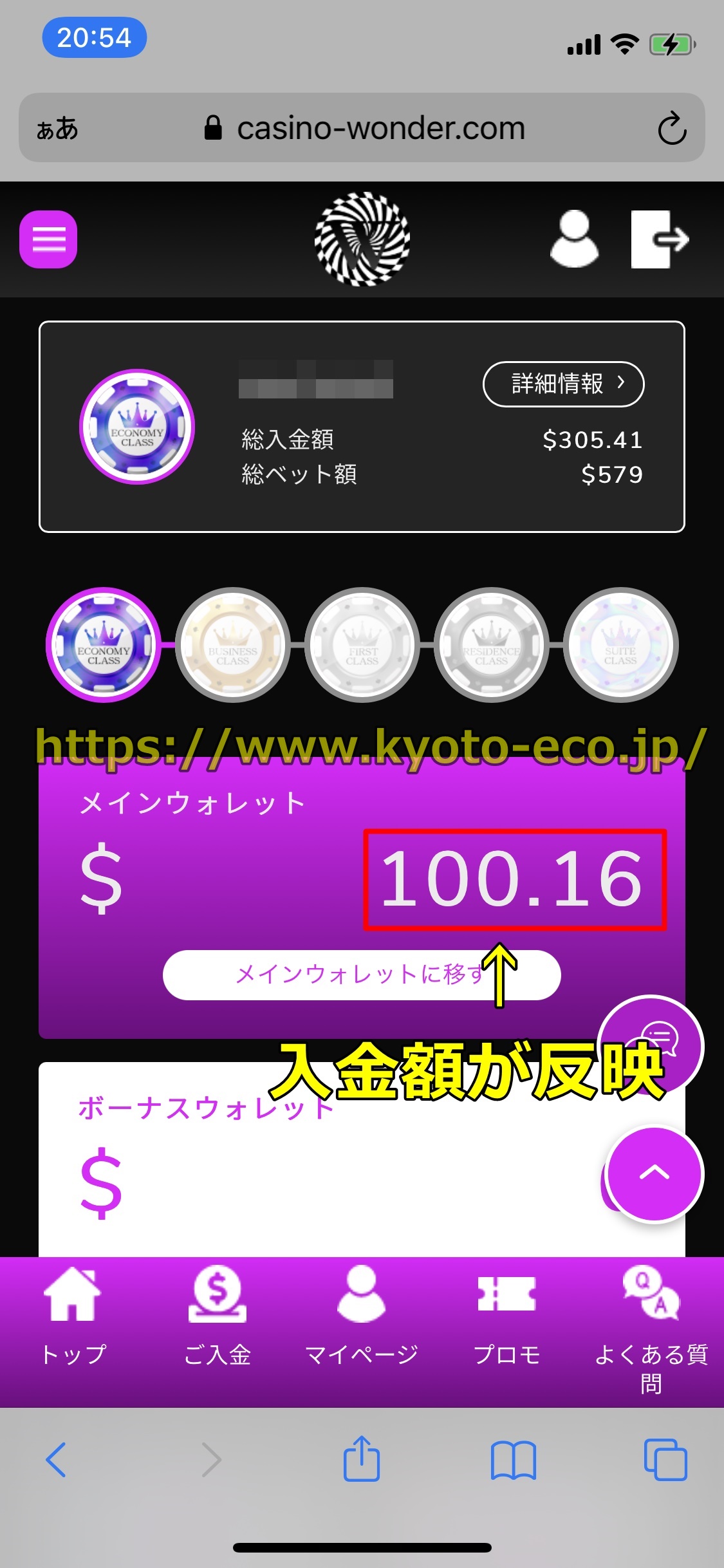 振込作業が完了後数分~30分してワンダーカジノの銀行振込(銀行送金)での入金処理が完了すると、画面上の残高に入金した金額が反映されています。