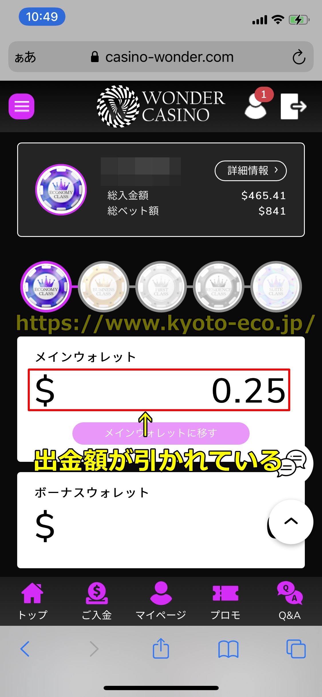 「OK」をクリックすると下の図にあるように画面が出て、「メインウォレット」から銀行振込(銀行出金)での出金額が引かれています。
