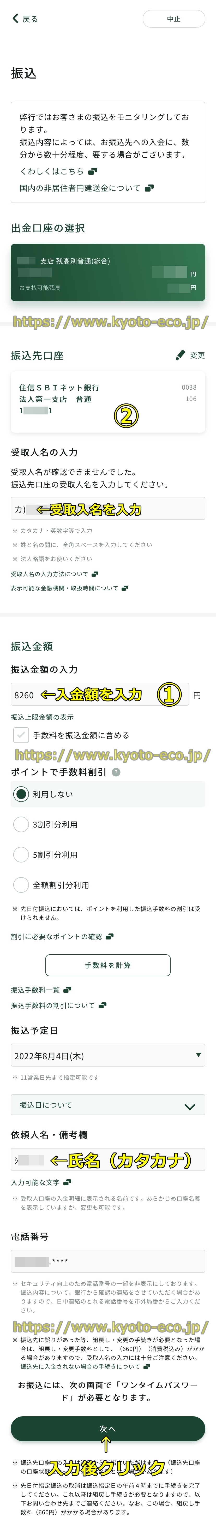振込のやり方は各銀行によって違いますので、あなたが利用している送金元銀行の手順に置き換えて振込作業を行ってください。