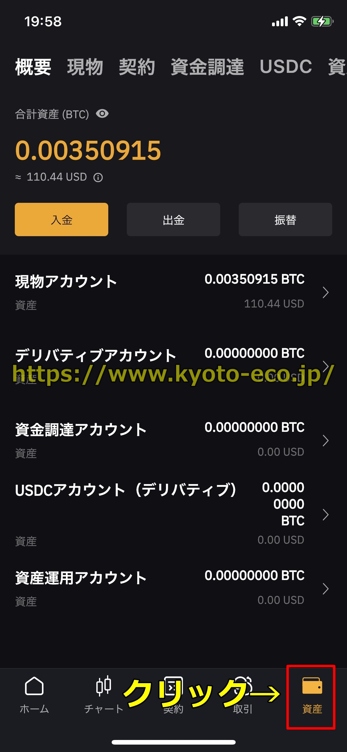 画面下のメニューの「資産」をクリックすると下の図にあるような画面が出ますので、「入金」をクリックしましょう。