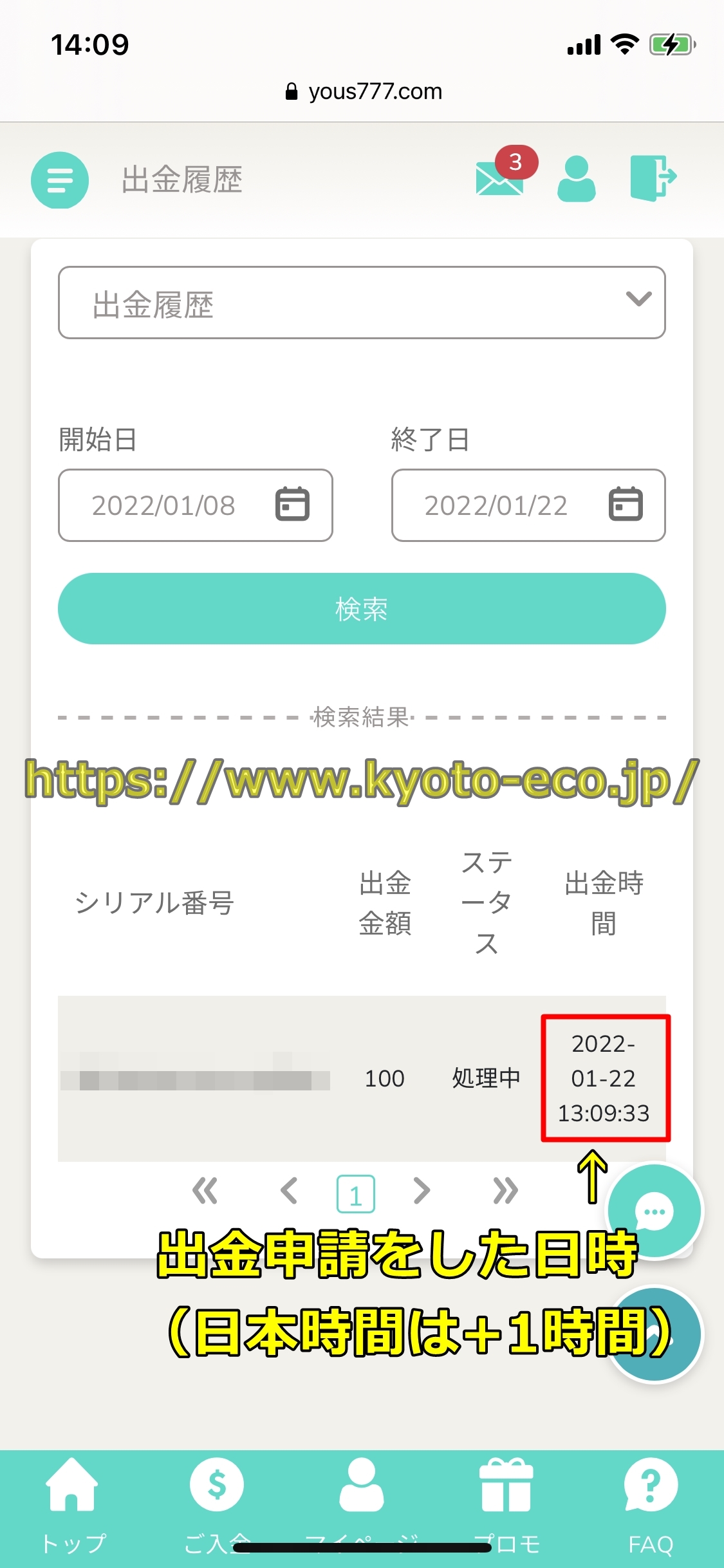 ・youscasinoでの出金申請の日時 2022/1/22 14:09